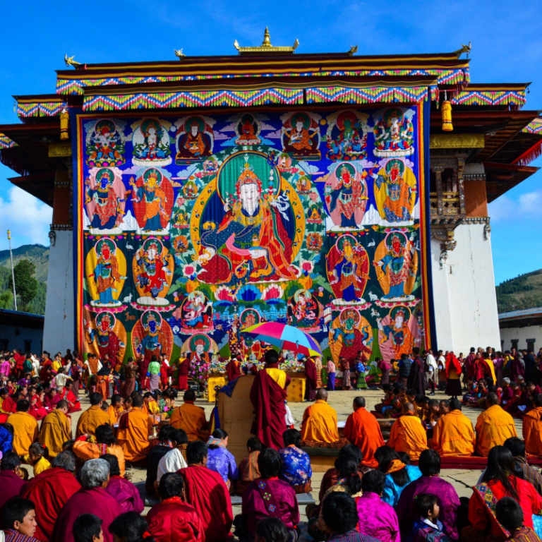 Among all the ritual moments in a Tsheschu, none is as charged as the unveiling of the thongdrol. These giant appliqué thangkas, forty meters high in some cases, are displayed only briefly, always at dawn, always on the climactic day of a Tshechu. The word itself explains the belief: thong (“to see”), drol (“liberation”).